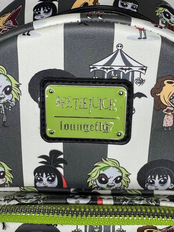 Keywords: Beetlejuice, mini backpack, character print, striped, neon green, Loungefly, Tim Burton, goth, quirky, collector item, themed, fan merchandise, day bag, travel