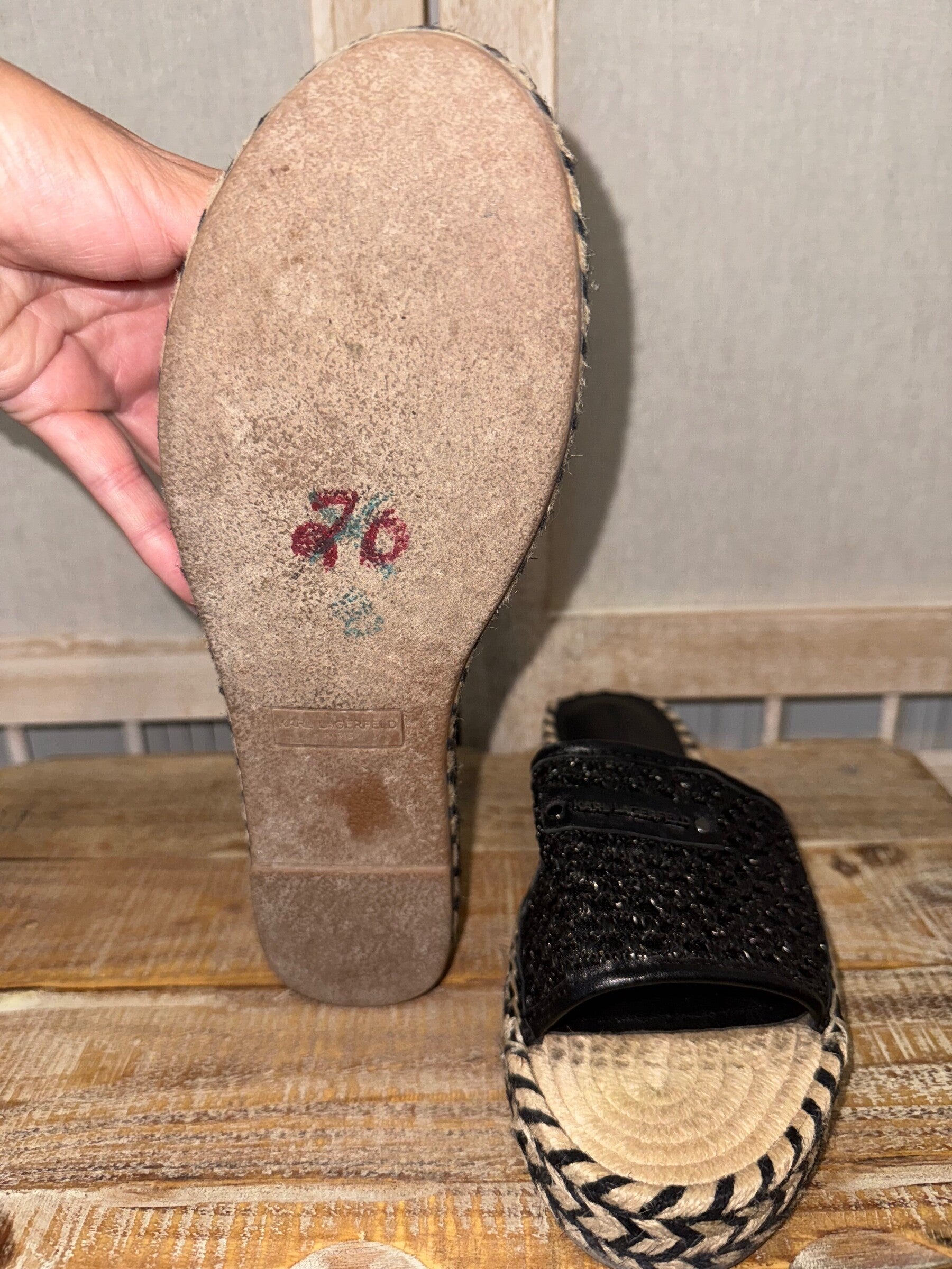 Keywords: Karl Lagerfeld, Sandals, Slides, Espadrille, Woven, Black Sandals, Womens Shoes, Size 8M, Designer Sandals, Comfortable Sandals, Casual Shoes, Resort Wear, Parisian Style, Slip On Shoes