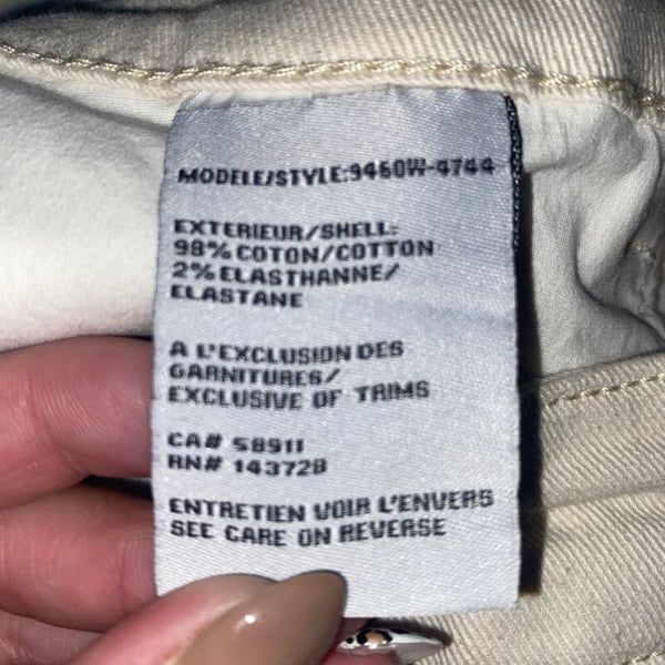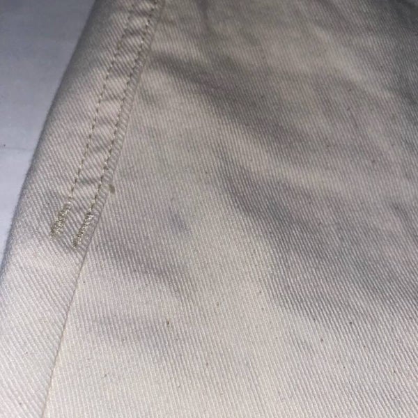 Elevated denim essential. These cream-beige jeans offer a flattering high-rise silhouette with a contemporary frayed hem for a touch of edgy sophistication. The classic five-pocket design and comfortable fit make them perfect for everyday wear, while the subtle details add a touch of uniqueness. Small blemish, as shown in the pictures. Imagine pairing these jeans with a tucked-in blouse and heels for a chic brunch outfit or dressing them down with sneakers and a tee for a casual weekend outing. They're also a great choice for a stylish travel look.