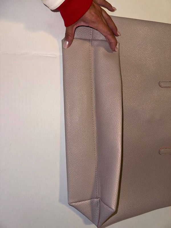 Keywords: scallop tote bag, bow tote bag, large tote bag, work tote, travel tote, handbag, purse, faux leather tote, beige tote bag, scalloped edge, bow accent, elegant tote, stylish tote, new with tags