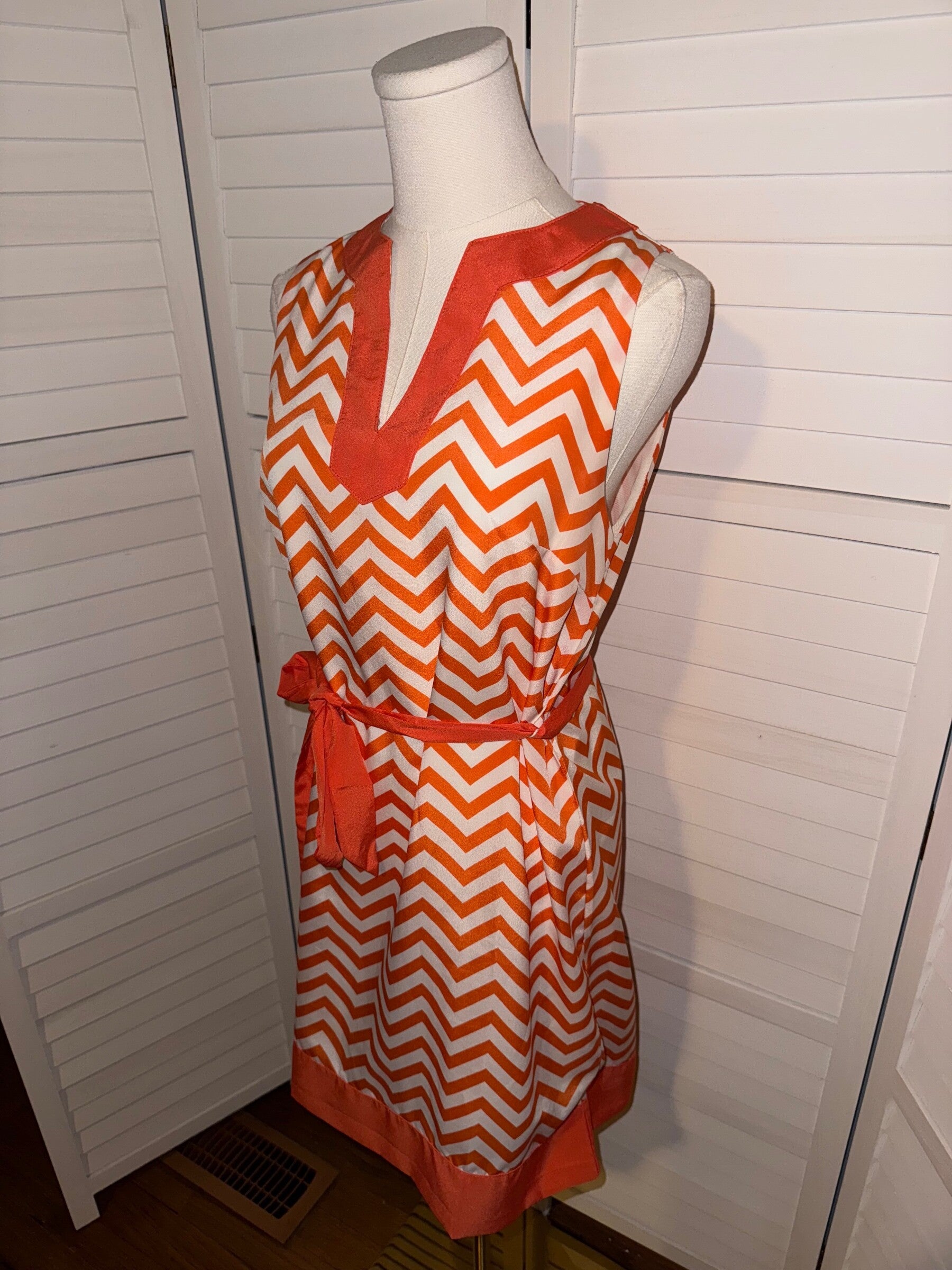 Keywords: Mud Pie, dress, chevron dress, orange and white, sleeveless dress, belted dress, summer dress, casual dress, womens dress, size small, preppy dress, v-neck dress, knee length dress, vacation dress