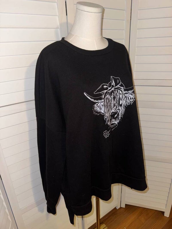 Keywords: Highland cow sweatshirt, black sweatshirt, womens sweatshirt, plus size sweatshirt, crew neck sweatshirt, graphic sweatshirt, cow graphic, western style, casual wear, relaxed fit, pullover sweatshirt, Zenana, 2X, cow print