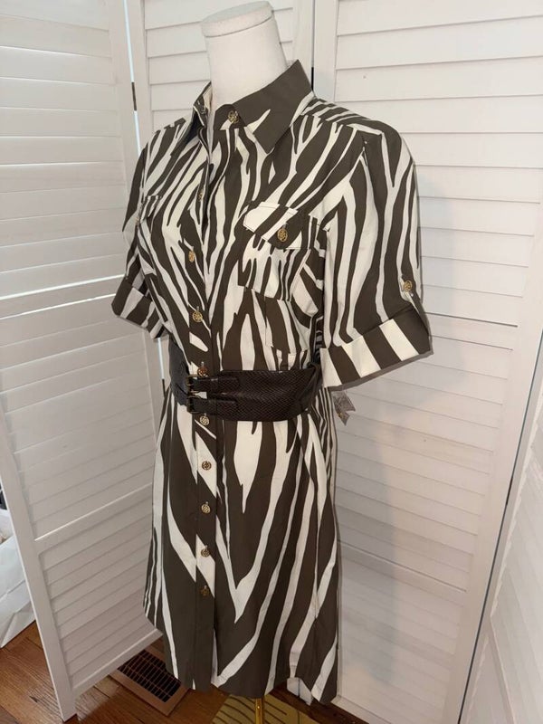 Keywords: Antonio Melani, zebra print dress, shirt dress, belted dress, safari dress, size 10, animal print, career dress, womens dress, button down dress, short sleeve dress, collared dress, brown and white dress, contemporary dress, fashion dress