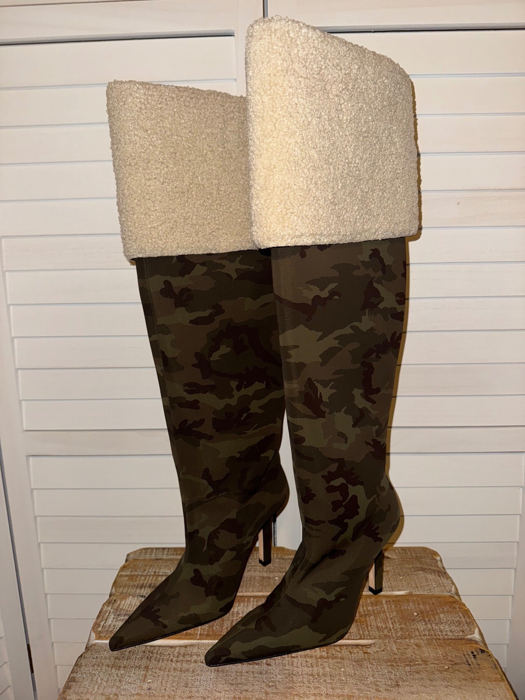 Keywords: Good American boots, Over the knee boots, High heel boots, Camo boots, Camouflage boots, Shearling cuff boots, Stiletto boots, Designer boots, Fashion boots, Womens boots, Size 5.5 boots, Statement boots, Knee High boots
