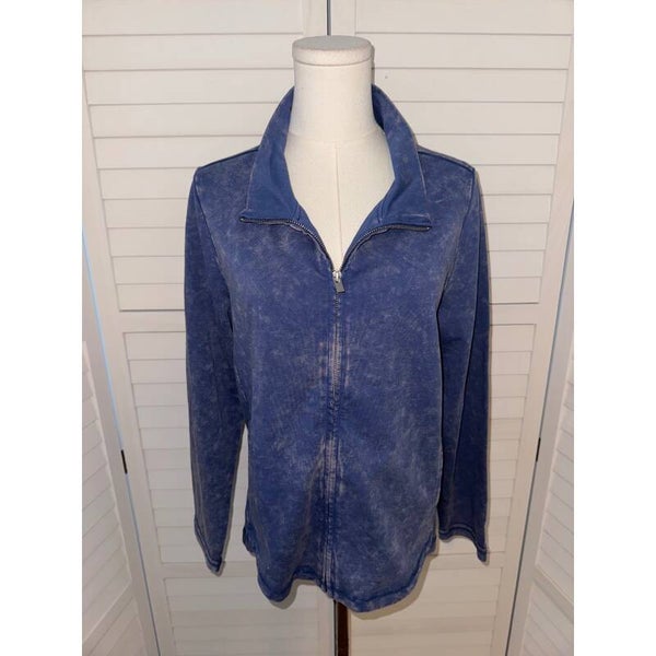 Elevated comfort defines this stylish jacket. It features a soft blue wash finish that adds a touch of relaxed sophistication, perfect for layering or wearing on its own. This jacket also features a full zip closure, a collared neckline, and convenient side pockets. Its flattering silhouette and versatile design make it an excellent choice for weekend outings, casual work environments, or cozy evenings at home.