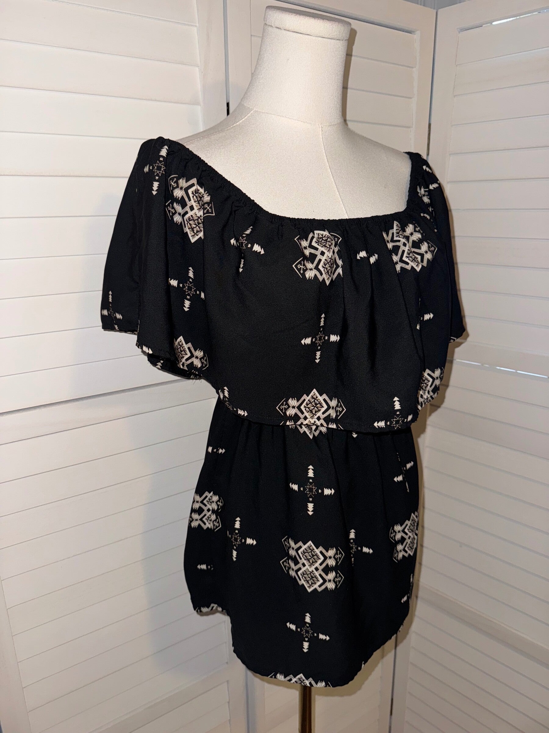 Keywords: The Impeccable Pig top, black off shoulder top, Aztec print blouse, boho peasant top, women's size small top, ruffle sleeve top, peplum hem top, geometric print shirt, casual summer top, festival wear, brunch outfit, flattering fit, unique print top