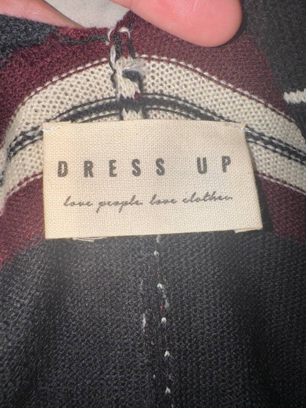 Keywords: Dress Up kimono cardigan, striped poncho sweater, fringe hem cardigan, womens knitwear M, bohemian layered top, casual chic outerwear, pocketed cardigan, versatile kimono, fall fashion, spring layering, comfortable lounge wear, elegant poncho