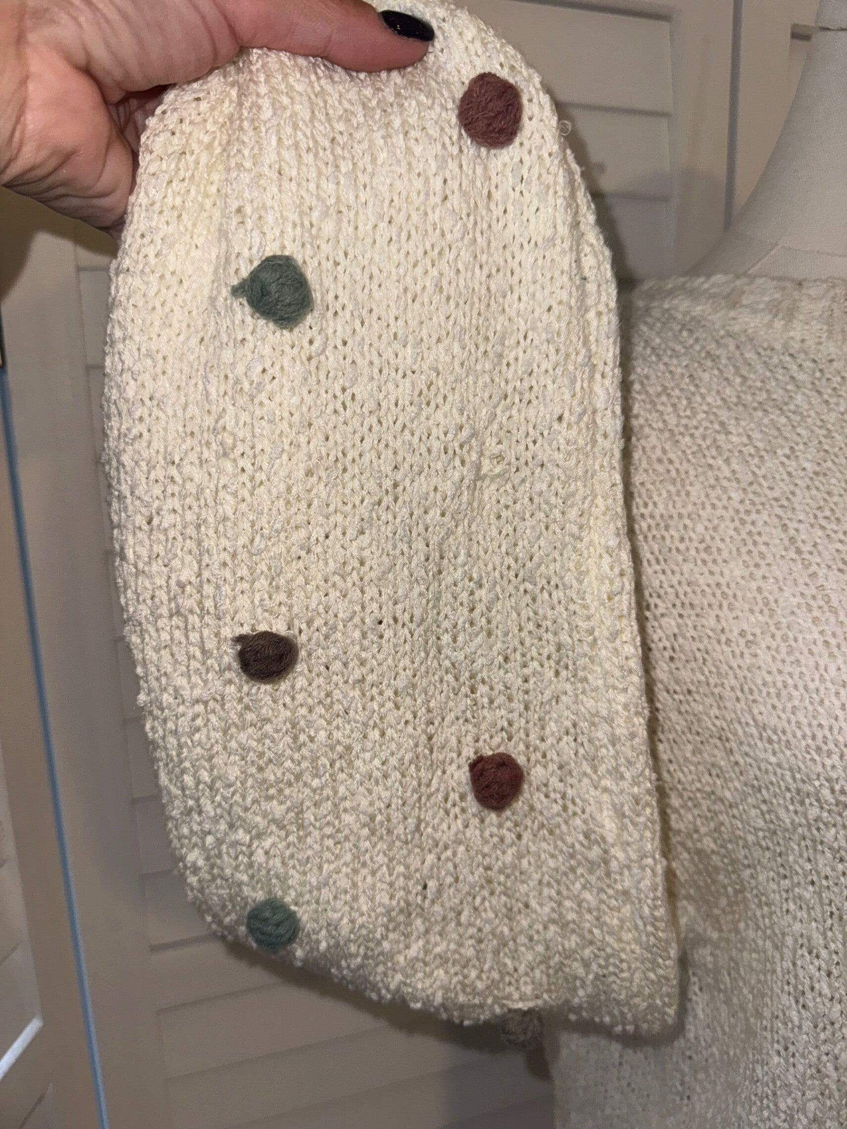 Keywords: cream knit sweater, textured sweater, pom pom sweater, multicolored pom detail, womens sweater, long sleeve sweater, cozy sweater, casual sweater, winter sweater, fall fashion, boho sweater, chunky knit, designer sweater, boutique sweater