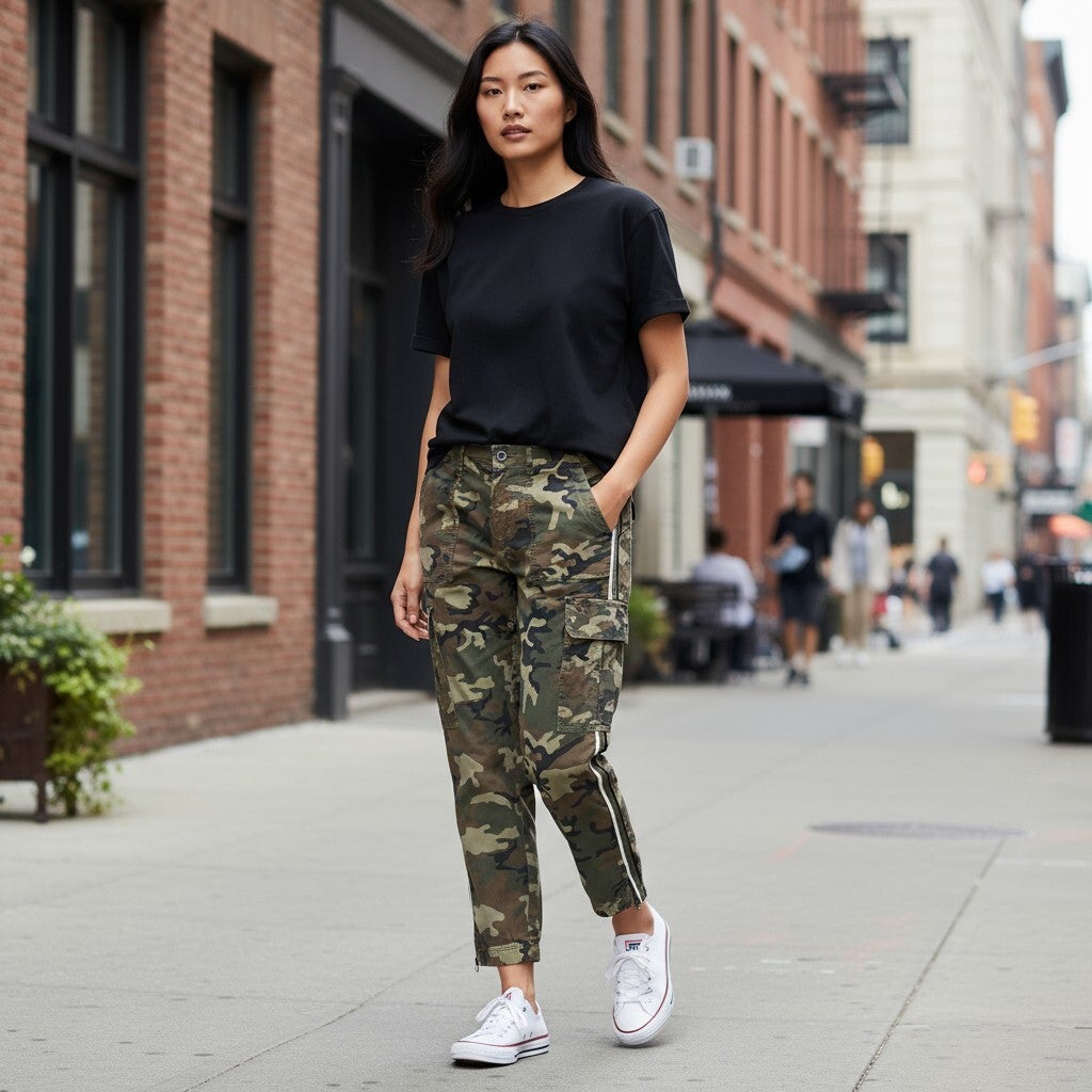 Embrace rugged chic with these Sanctuary Standard Surplus cargo pants, designed to effortlessly blend style and utility. The authentic camouflage pattern, rendered in earthy tones, offers a timeless aesthetic that speaks to your adventurous spirit. Crafted for comfort and durability, these pants feature practical cargo pockets for ample storage and stylish white stripe detailing along the side, leading to zip closures at the ankle for a customizable fit. Perfect for a casual weekend outing, exploring urban streets, or adding a touch of edgy flair to your everyday wardrobe.