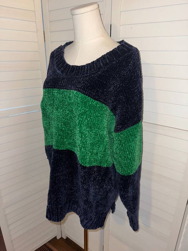 Keywords: OFFLINE by Aerie sweater, cozy chenille sweater, striped pullover, women's loungewear, soft knit sweater, long sleeve top, casual sweater, green and navy sweater, plush fabric sweater, relaxed fit sweater, Aerie loungewear, fall fashion
