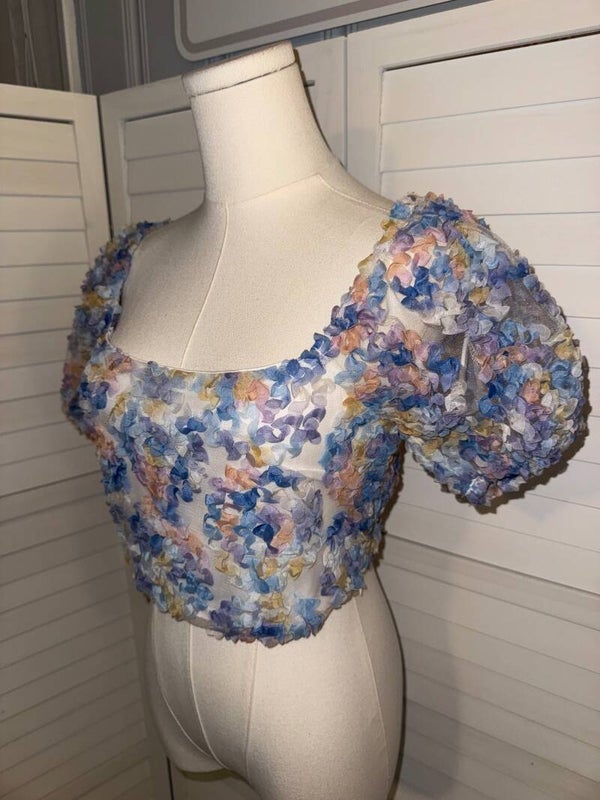 Keywords: LE LIS COLLECTION crop top, floral puff sleeve top, square neck crop top, 3D floral applique top, mesh crop top, women's fashion top, party top, brunch outfit, summer top, romantic top, whimsical top, chic top, trendy crop top, designer inspired