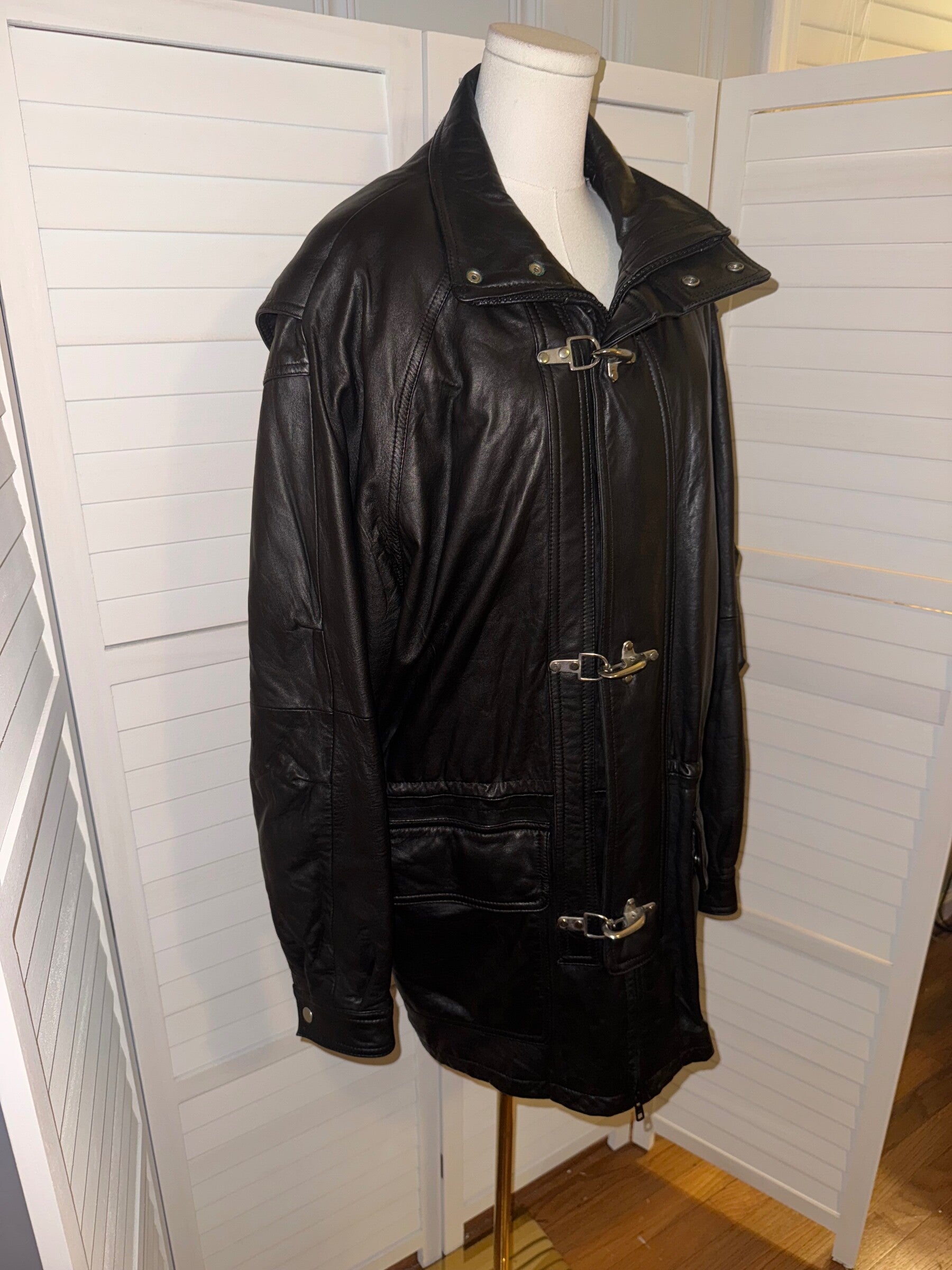 Keywords: mens leather coat, black leather jacket, duffle toggle coat, mens winter coat, quilted lined jacket, leather outerwear, mens fashion, classic leather coat, warm jacket, stylish mens coat, mens outerwear, leather coat, mens winter jacket