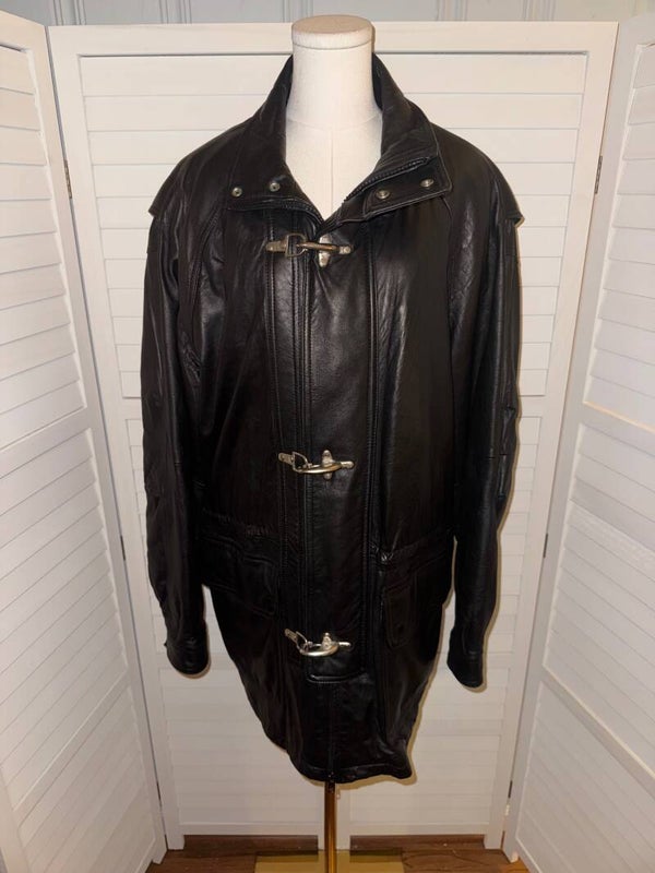 Vintage Tannery West Men Black Leather Duffle Toggle Jacket Quilted Lined Size M