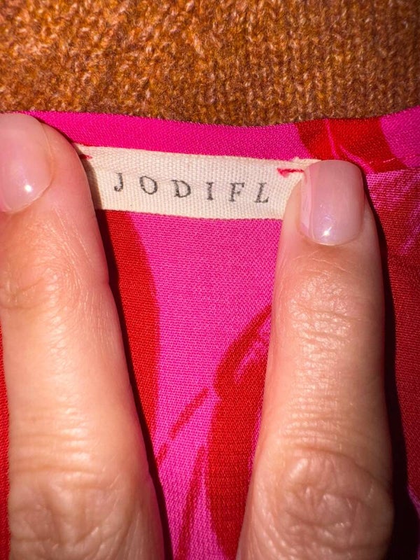 Keywords: JODIFL blouse, women's top, pink blouse, red print blouse, abstract print, v-neck top, long sleeve blouse, fashion top, stylish blouse, elegant top, statement blouse, party top, brunch outfit, work blouse, designer inspired