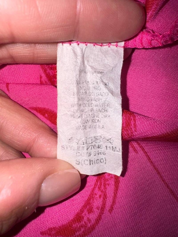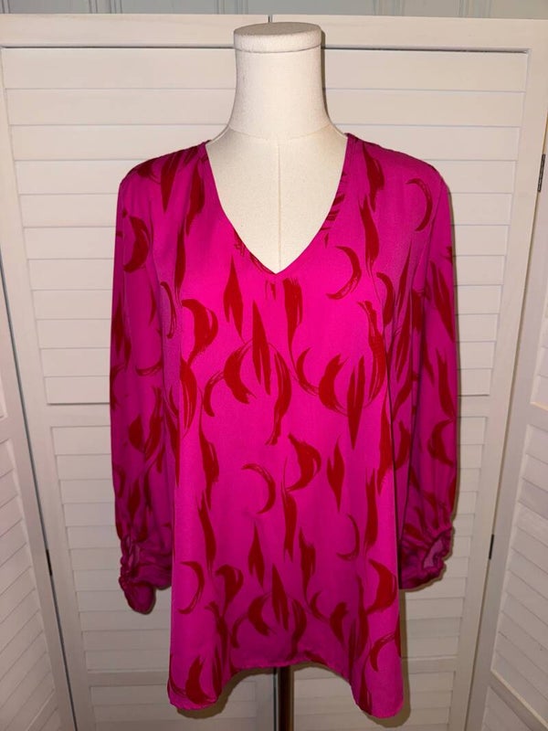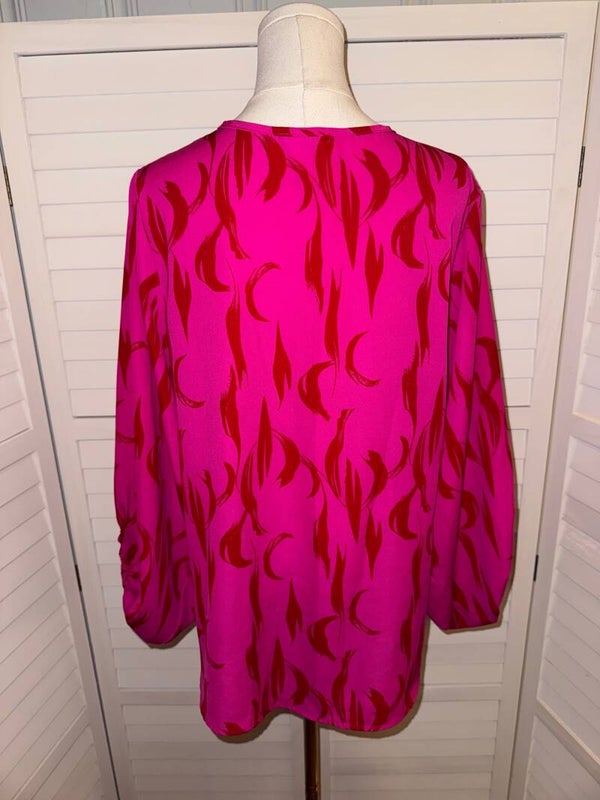 JODIFL Women's Pink Red Abstract Print V-Neck Long Sleeve Blouse Top S