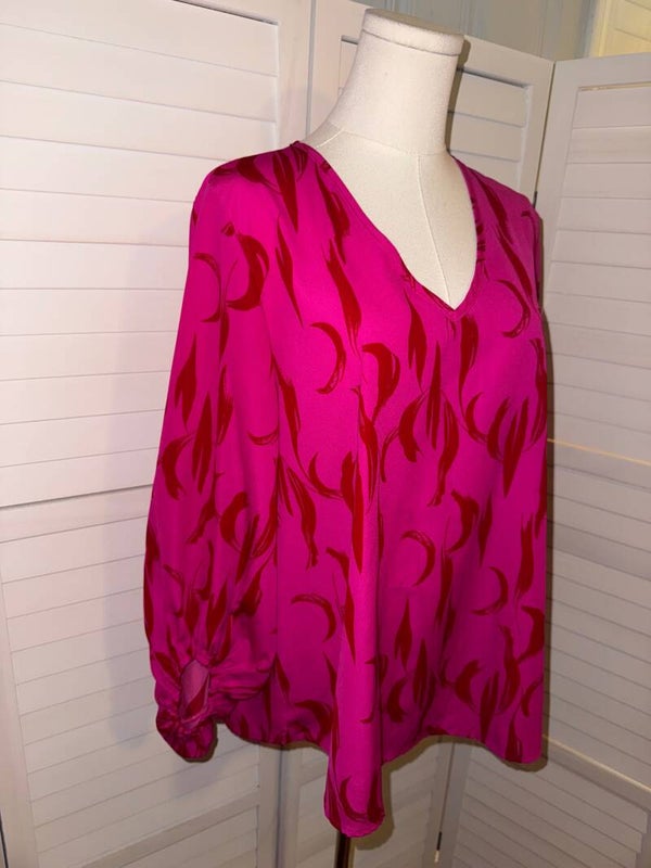 Radiate vibrant energy in this eye-catching JODIFL blouse, designed to make a statement. The striking fuchsia hue is beautifully adorned with a dynamic red abstract print, reminiscent of flowing flames and graceful curves, creating a visually captivating pattern that dances across the fabric. Its flattering V-neckline elongates your silhouette, while the elegant long sleeves, complete with gathered cuffs, add a touch of sophisticated flair. Crafted for comfort and style, this blouse drapes effortlessly, offering a flattering fit that moves with you. Elevate your wardrobe with this versatile piece, perfect for a chic brunch, a stylish evening out, or a creative professional setting.