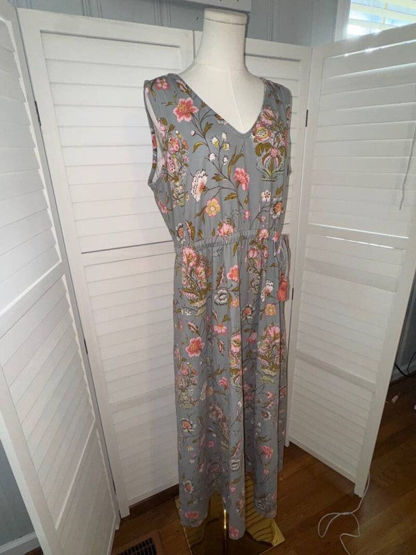 Spartina Floral Maxi Dress V Neck Sleeveless Drawstring Waist Boho Size Large