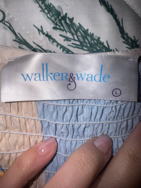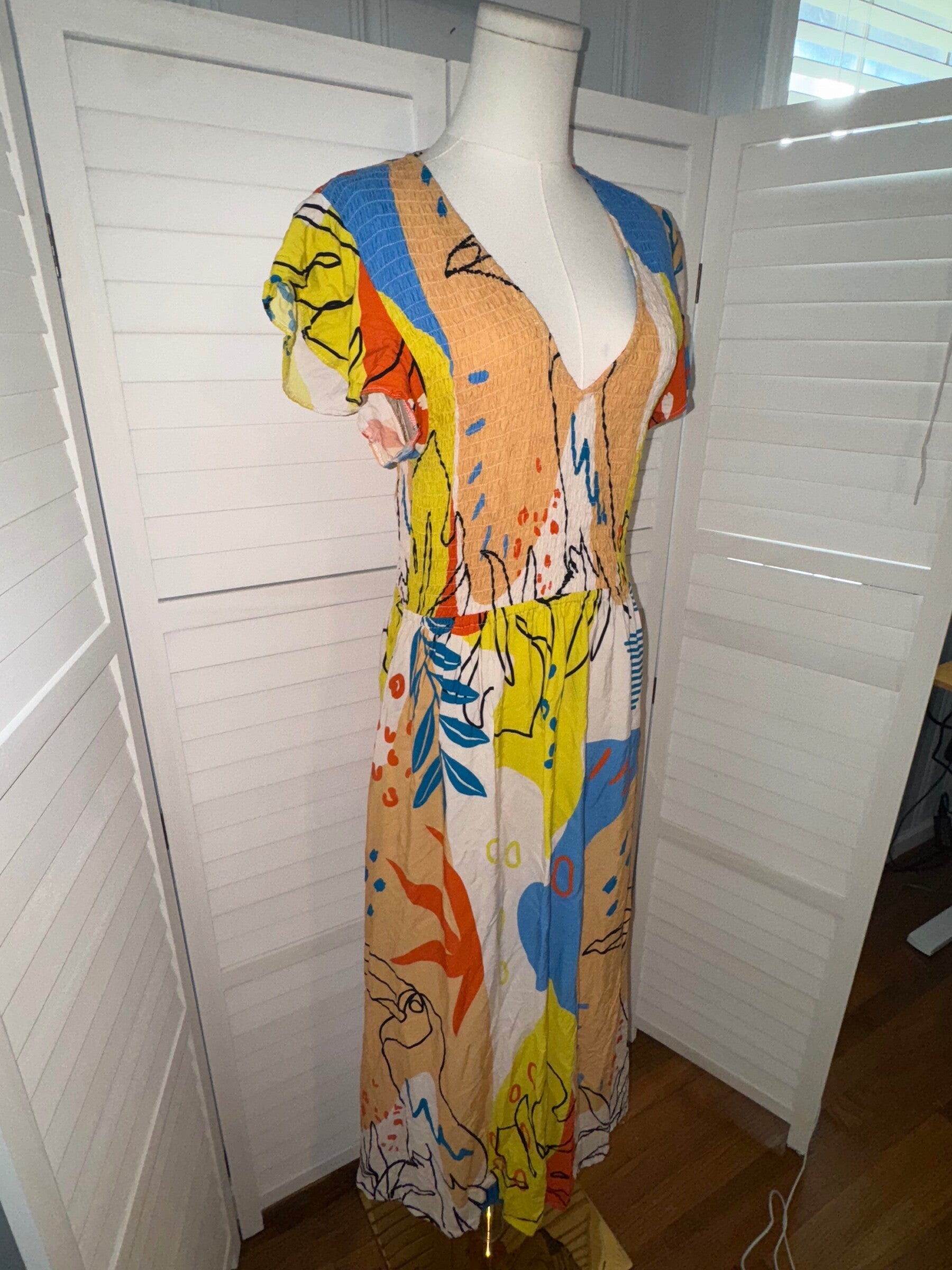 Keywords: Walker & Wade dress, maxi dress, abstract print dress, floral maxi dress, smocked dress, flutter sleeve dress, v neck dress, summer dress, boho dress, vacation dress, beach dress, women's dress, size L dress, rayon dress, midi dress