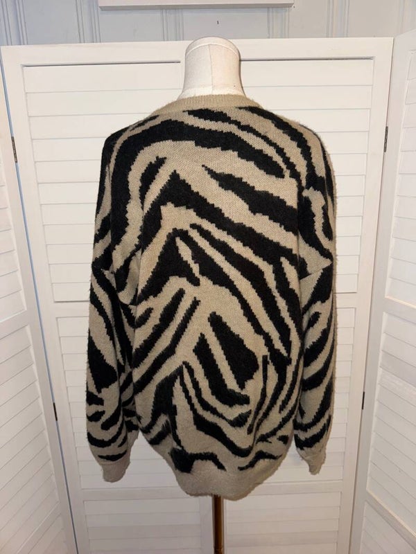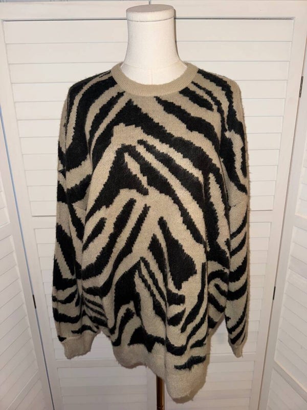 Keywords: MUMU, zebra print, animal print, knitwear, crew neck, long sleeve, cozy, statement piece, fashionable, casual wear, fall fashion, winter style, bold pattern