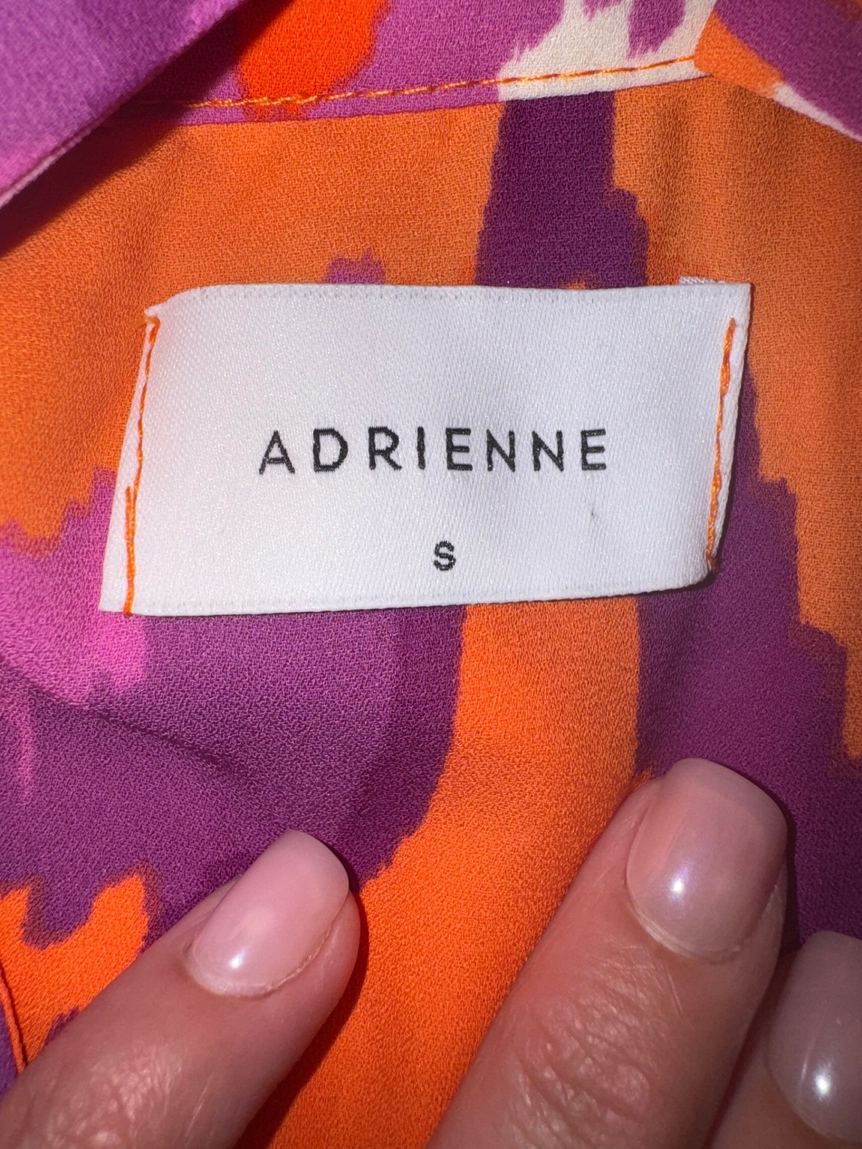 Make a vibrant statement with this eye-catching Adrienne mini dress. The bold abstract print, a captivating fusion of fiery orange, rich purple, and soft pink, creates a mesmerizing visual effect that's sure to turn heads. Designed with a flattering V-neckline and a voluminous, dramatic collar that frames your face with flair, this dress exudes a playful yet chic retro vibe. The long, billowy sleeves add a touch of elegance and movement, while the relaxed silhouette ensures comfortable wear. Perfect for a lively brunch, a casual day out exploring, or a fun evening gathering.