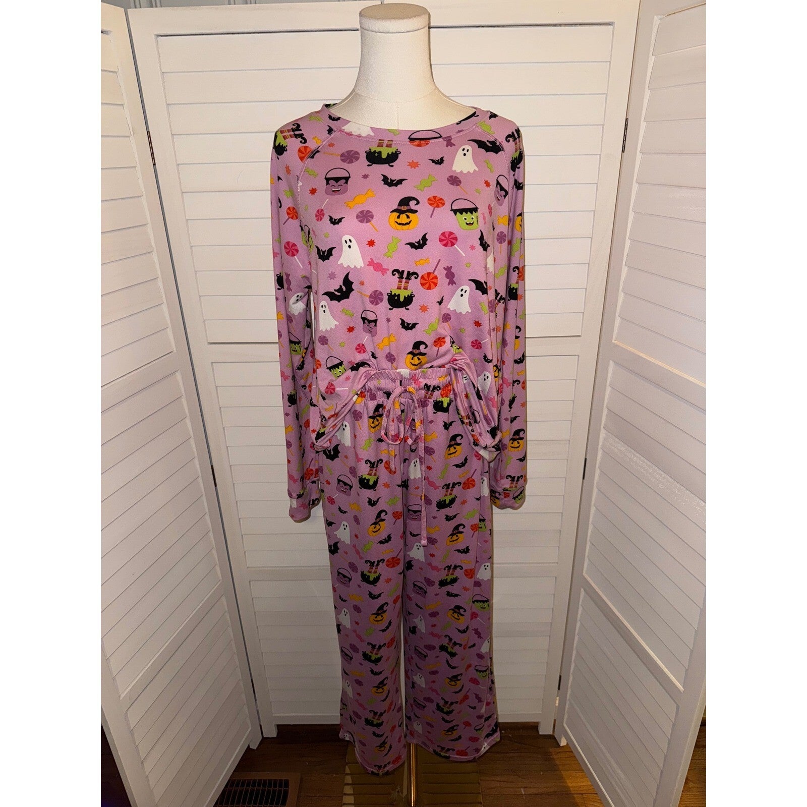 Keywords: pajama set, loungewear, sleepwear, Halloween, spooky print, ghosts, pumpkins, bats, pink, long sleeve, drawstring pants, cozy, festive, womens