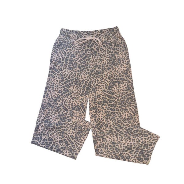 Embrace ultimate comfort and style with these Z Supply leopard print lounge pants. Crafted for a relaxed yet chic feel, these wide-leg pants feature a playful leopard pattern in a sophisticated tan and grey palette. The adjustable drawstring waist ensures a perfect personalized fit, while the generous wide leg offers effortless movement and a trendy silhouette. Imagine sinking into these luxurious pants after a long day or lounging in them on a lazy weekend morning. Perfect for cozy evenings at home, casual outings, or as stylish sleepwear.