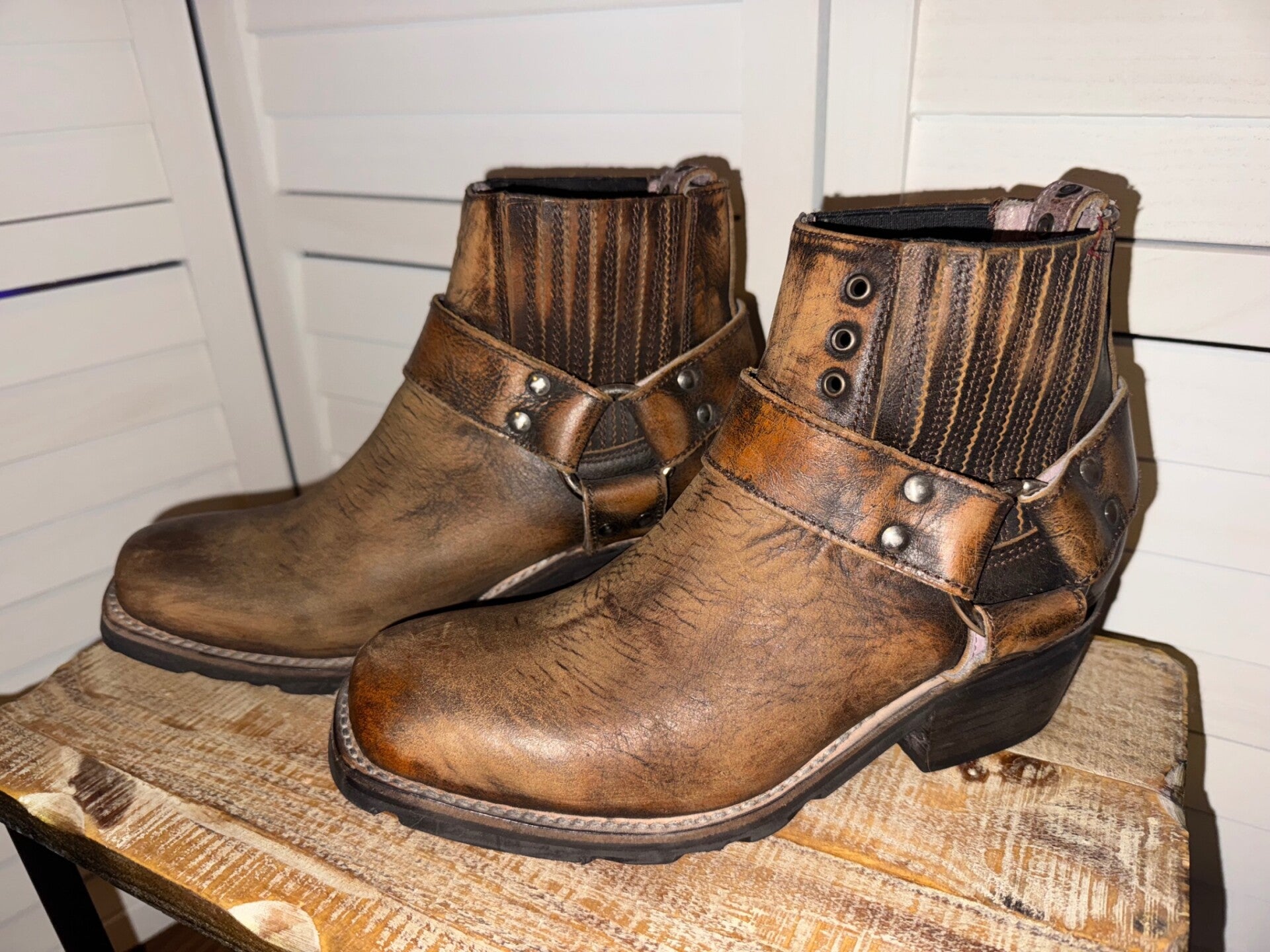 Keywords: freebird boots, leather ankle boots, harness boots, distressed leather, square toe boots, western style, boho boots, rocker chic, casual boots, fall fashion, motorcycle boots, edgy boots, cowgirl boots