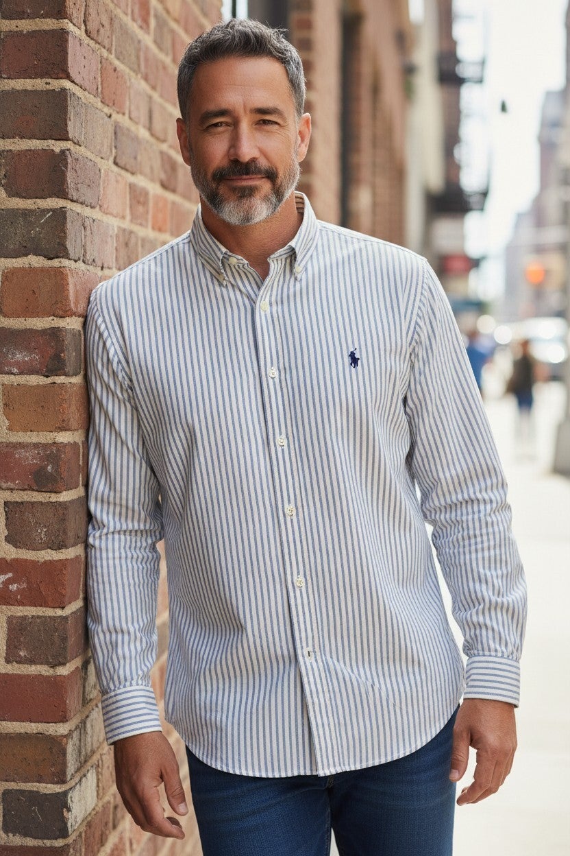 Keywords: Ralph Lauren shirt, men's dress shirt, striped button up, classic fit, Yarmouth cotton, Polo Ralph Lauren, business casual, smart casual, workwear, weekend wear, preppy, collegiate, tailored