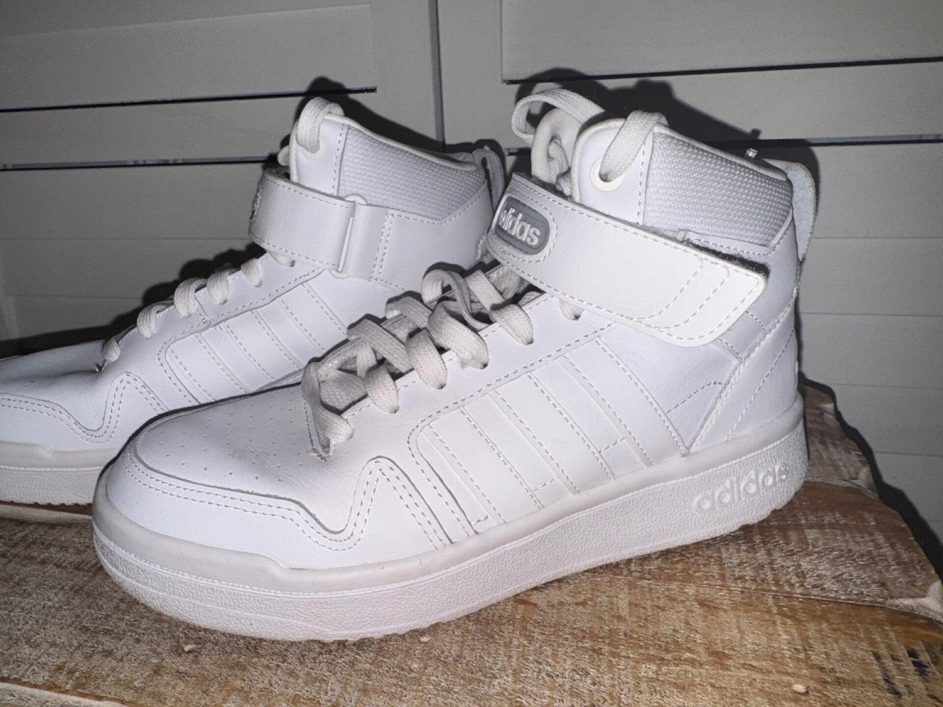 Step into timeless style with these crisp white Adidas high-top sneakers. Iconic three-stripe detailing adorns the sides, offering a signature athletic aesthetic that complements any casual look. The secure hook-and-loop ankle strap ensures a locked-in feel, providing both support and a touch of modern flair. Perfect for everyday wear, running errands, or adding a sporty edge to your weekend ensemble.