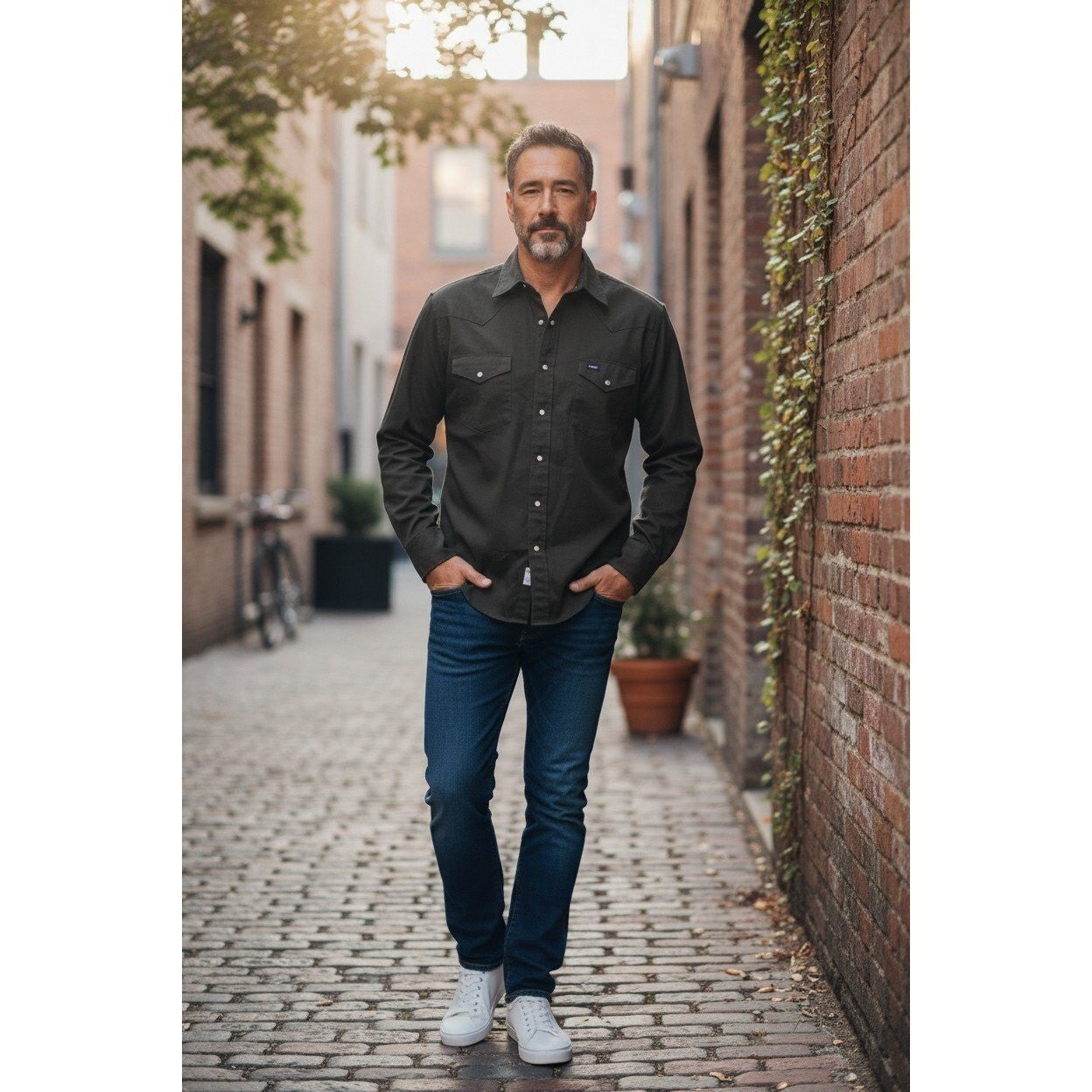 Keywords: Wrangler shirt, mens western wear, snap button shirt, olive green shirt, long sleeve button down, cowboy shirt, ranch wear, outdoor apparel, classic fit, rugged style, casual shirt, workwear