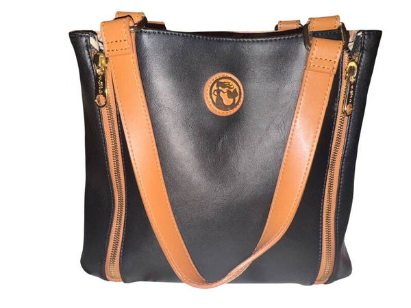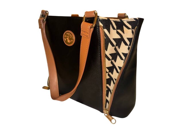 Spartina 449 Black Tan Genuine Leather Houndstooth Accent Tote Bag