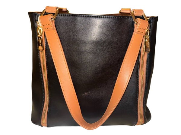 Discover chic sophistication with this Spartina 449 tote, a perfect blend of classic design and modern flair. The rich black genuine leather exterior is beautifully complemented by warm tan straps and striking houndstooth accent panels, adding a touch of distinctive personality. Functional side zippers offer an expandable option for when you need a little extra space. Carry your essentials in style wherever you go, from a busy workday to a weekend getaway.