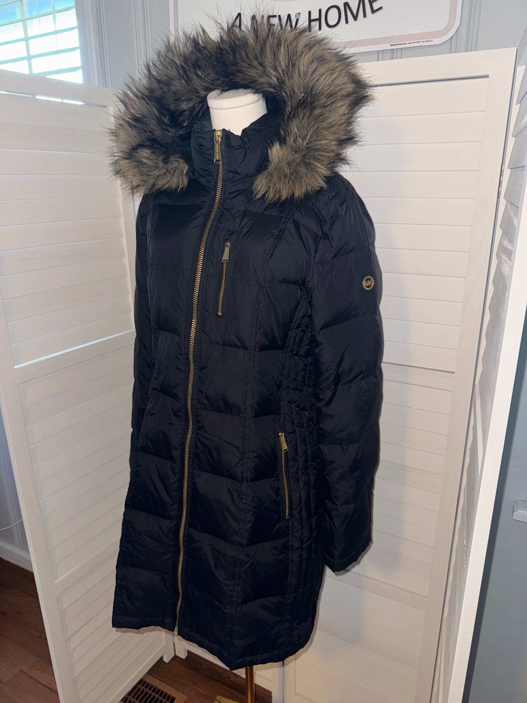 Keywords: Michael Kors, puffer coat, down jacket, fur hood, winter coat, designer outerwear, fashionable, warm, stylish, chic, gold hardware, black jacket, long coat