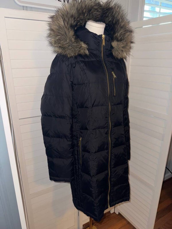Conquer the cold in this luxurious Michael Kors puffer coat, designed to keep you warm and stylish. Plush down fill envelops you in cozy comfort, while the dramatic faux fur trimmed hood adds a touch of glamour. Gleaming gold zippers accent the sleek black exterior, creating a sophisticated silhouette that moves effortlessly from city streets to weekend getaways. Perfect for braving chilly commutes or enjoying a crisp winter stroll.