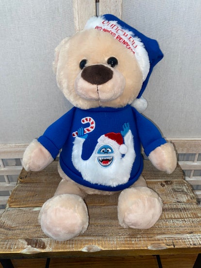 Keywords: Rudolph the Red Nosed Reindeer, Bumble, Abominable Snow Monster, Bear Plush, Christmas, Holiday, Stuffed Animal, Toy, Collectable, Teddy Bear, Blue Sweater, Santa Hat, Gift, Decor, Festive